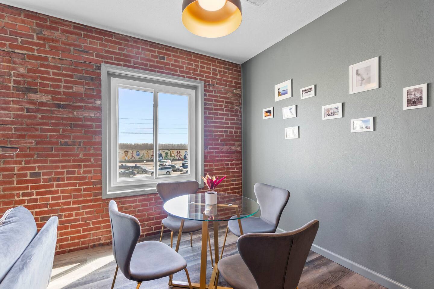 Step into this charming 2-bedroom, 1-bathroom apartment, boasting natural light and distinctive character. Situated on the second floor of a corner brick building, the exposed brick interior coupled with cozy furnishings sets a welcoming ambiance. Local artwork graces the walls, showcasing Cape Girardeau's unique flair. The primary bedroom features a queen-size bed, a spacious walk-in closet, and a dedicated workspace with a standing desk! The second bedroom features a queen-size bed and clothing storage for your convenience There is a full bathroom with tub/shower with complimentary toiletries for your comfort. The open-concept living/dining/kitchen area is perfect for relaxation and socializing. Sink into the inviting living space, unwind on the sofa, and catch up on your favorite shows via the Smart TV. The fully equipped kitchen is ready for cooking a delicious meal or simply brewing your morning cup of coffee. And don't forget the added convenience of complimentary in-unit laundry facilities, ensuring a seamless stay from start to finish!