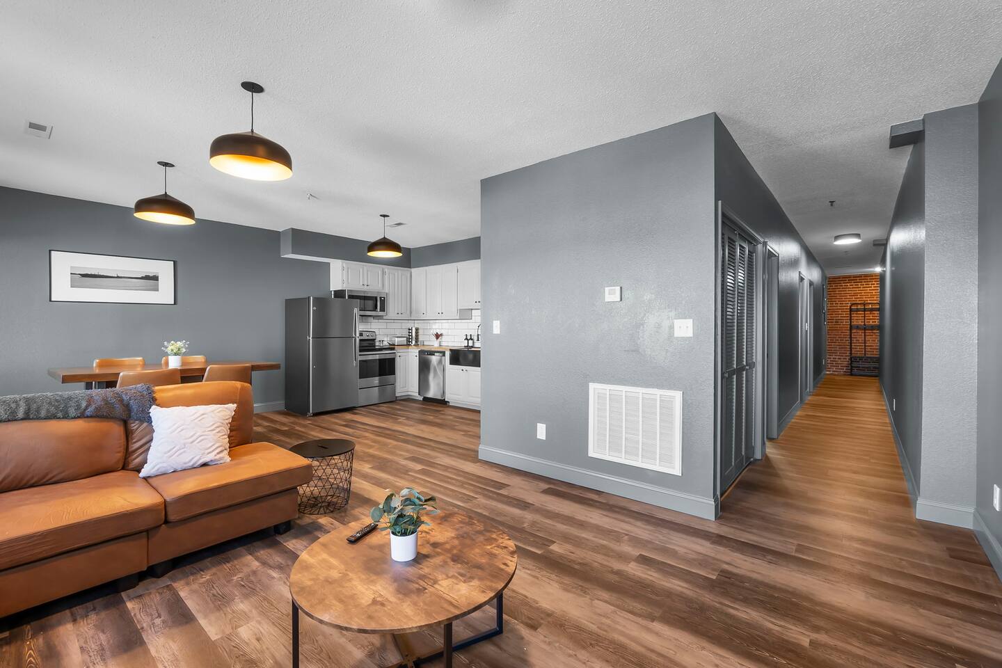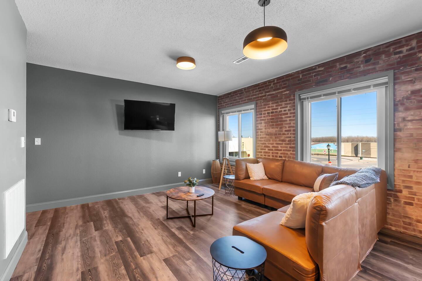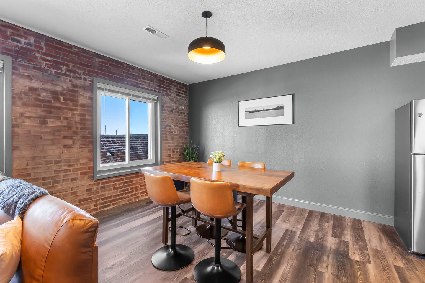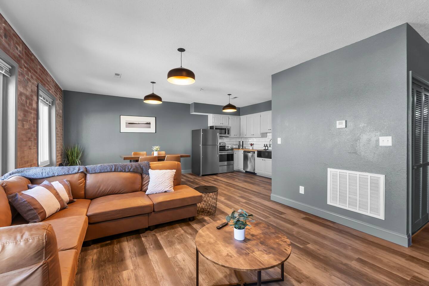 This 2 bedroom, 2 bathroom apartment offers plenty of space, natural light, and character. Located on the second floor of a corner brick building, the exposed brick interior and warm furnishings create an inviting atmosphere. Unique local artwork is featured in the unit to add a touch of Cape Girardeau’s personality and charm. The primary bedroom features a comfy king-size bed and clothing storage. Enjoy the privacy of the full ensuite bathroom with toiletries provided. The second bedroom has a comfortable queen-size bed and clothing storage. There is a second full bathroom with toiletries provided as well. The living/dining/kitchen space is open-concept. Relax in the cozy living area, kick back on the sofa (can double as an extra sleeping space if needed), and watch a movie or your favorite show on the Smart TV. The full kitchen offers everything you need to prepare a delicious meal or your morning beverage during your stay and is adjacent to the dining area which can also be used as a dedicated workspace. Enjoy the complimentary laundry inside the unit!