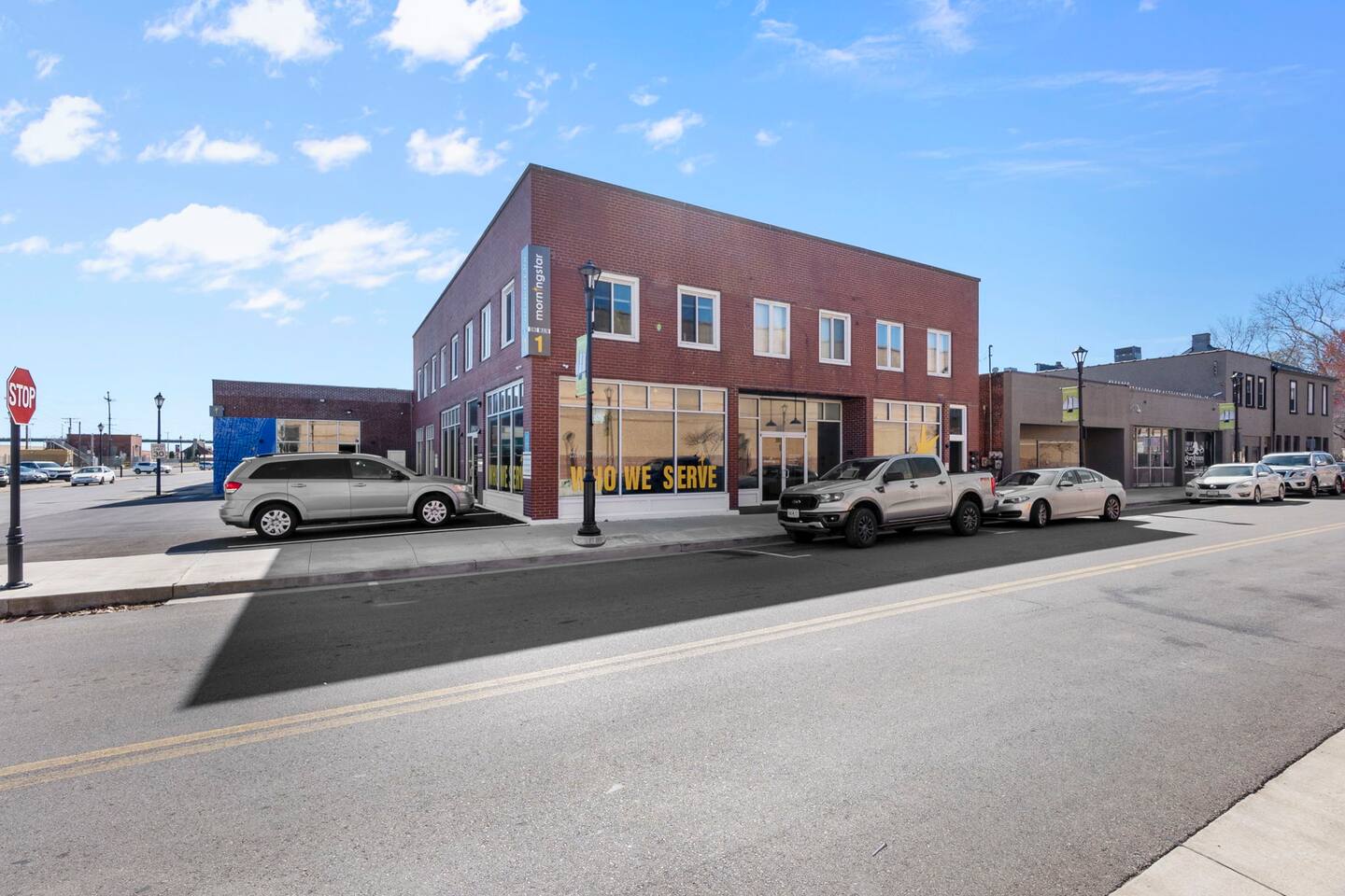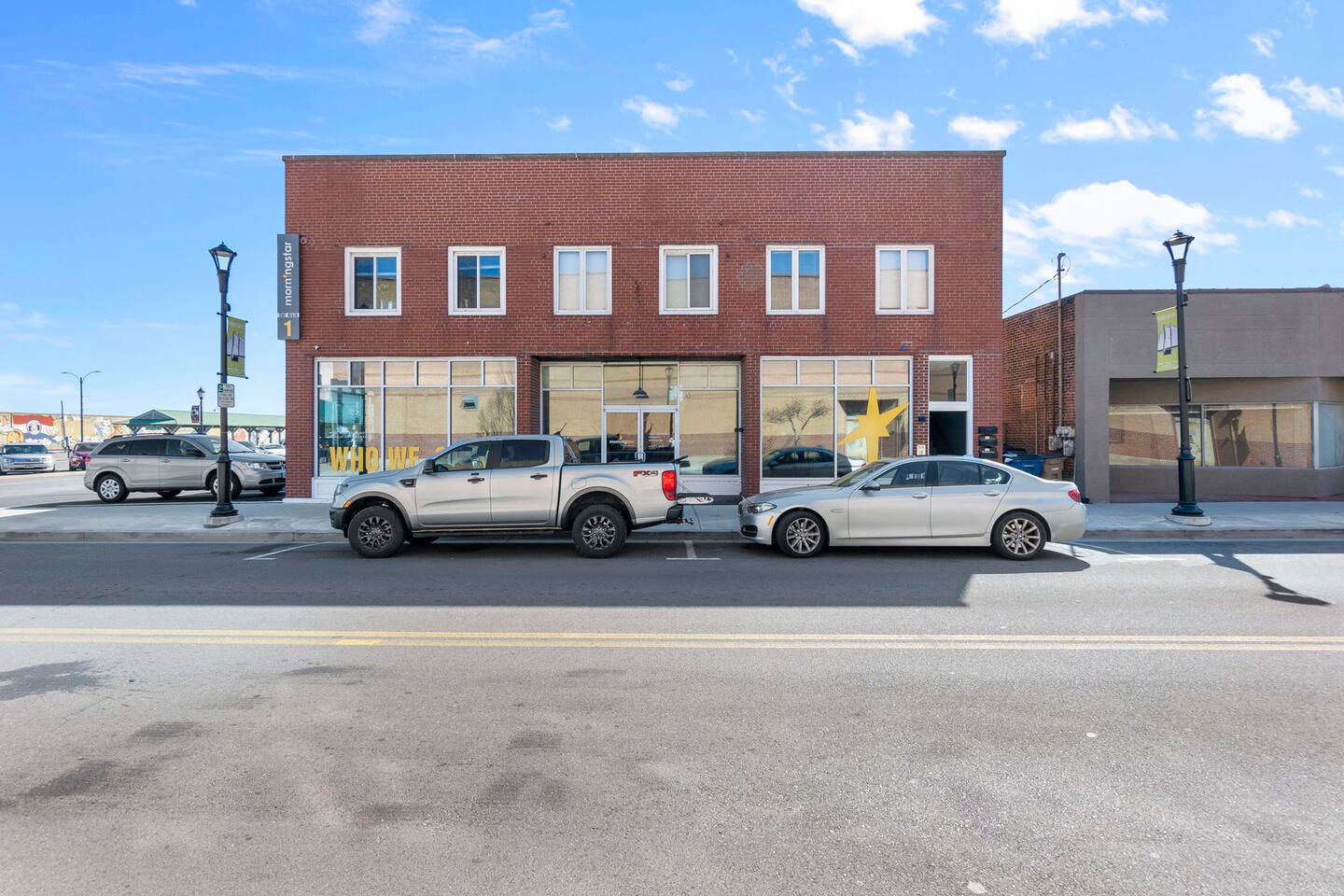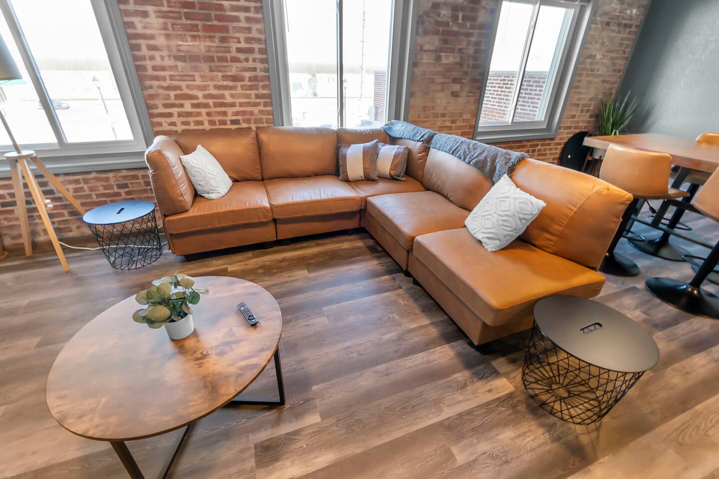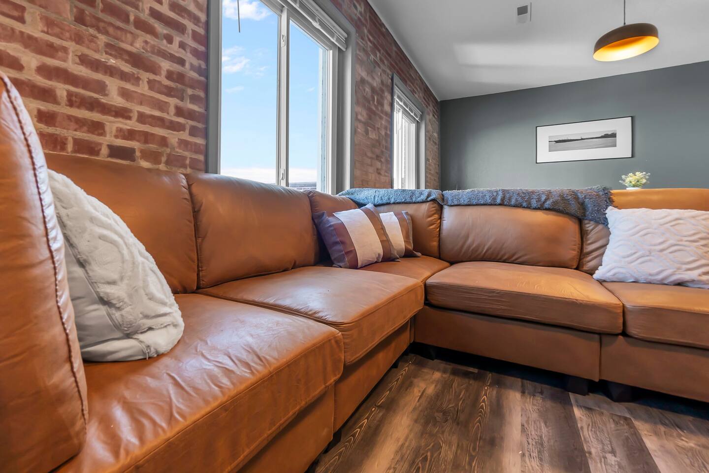 This 2 bedroom, 2 bathroom apartment offers plenty of space, natural light, and character. Located on the second floor of a corner brick building, the exposed brick interior and warm furnishings create an inviting atmosphere. Unique local artwork is featured in the unit to add a touch of Cape Girardeau’s personality and charm. The primary bedroom features a comfy king-size bed and clothing storage. Enjoy the privacy of the full ensuite bathroom with toiletries provided. The second bedroom has a comfortable queen-size bed and clothing storage. There is a second full bathroom with toiletries provided as well. The living/dining/kitchen space is open-concept. Relax in the cozy living area, kick back on the sofa (can double as an extra sleeping space if needed), and watch a movie or your favorite show on the Smart TV. The full kitchen offers everything you need to prepare a delicious meal or your morning beverage during your stay and is adjacent to the dining area which can also be used as a dedicated workspace. Enjoy the complimentary laundry inside the unit!
